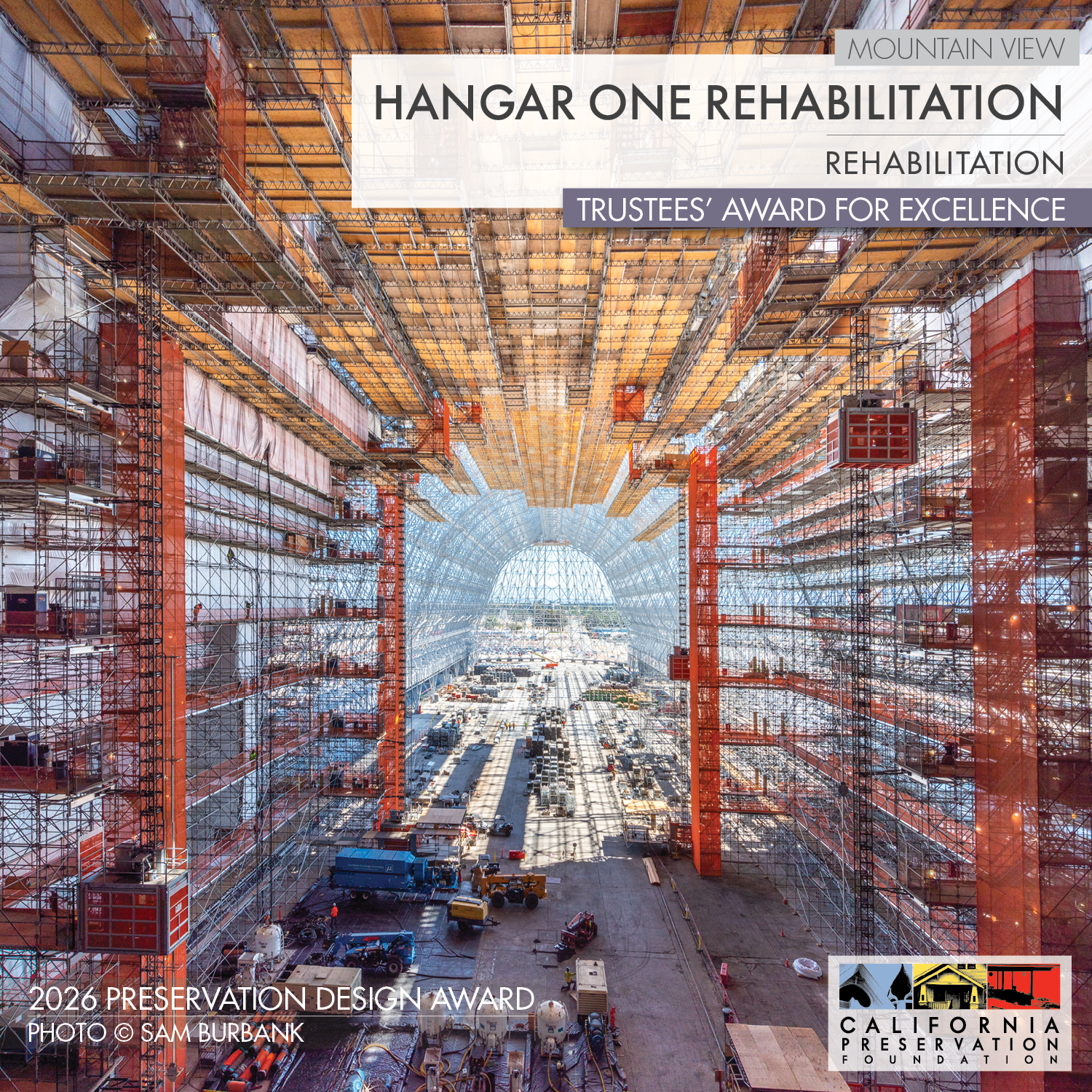 Hangar One Rehabilitation is a winner for the 2026 Preservation Design Award, receiving the prestigious Trustees’ Award for Excellence in the category of Rehabilitation. Award recipients are selected by a jury of top professionals in the fields of architecture, engineering, planning, and history, as well as renowned architecture critics and journalists. Tickets and sponsorship options are available at californiapreservation.org/programs/awards/.