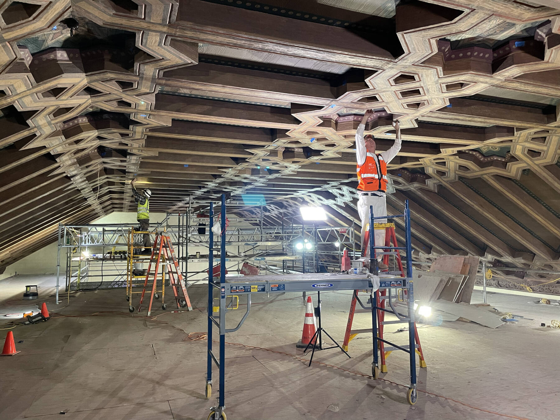 The seismic retrofit incorporated cutting-edge techniques and materials. To strengthen the structure, the team installed 33 tons of steel, comprising more than 350 linear feet of reinforcement, strategically placed above the historic ceiling without compromising its delicate frescoed panels. Approximately 14,000 square feet of Kevlar fiber-reinforced polymer (FRP) was applied to the underside of the existing roof deck, providing lightweight, robust shear reinforcement incorporating 2,400 drilled anchors installed into the existing structure.