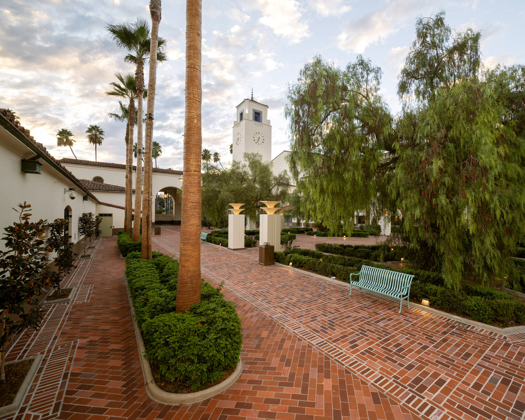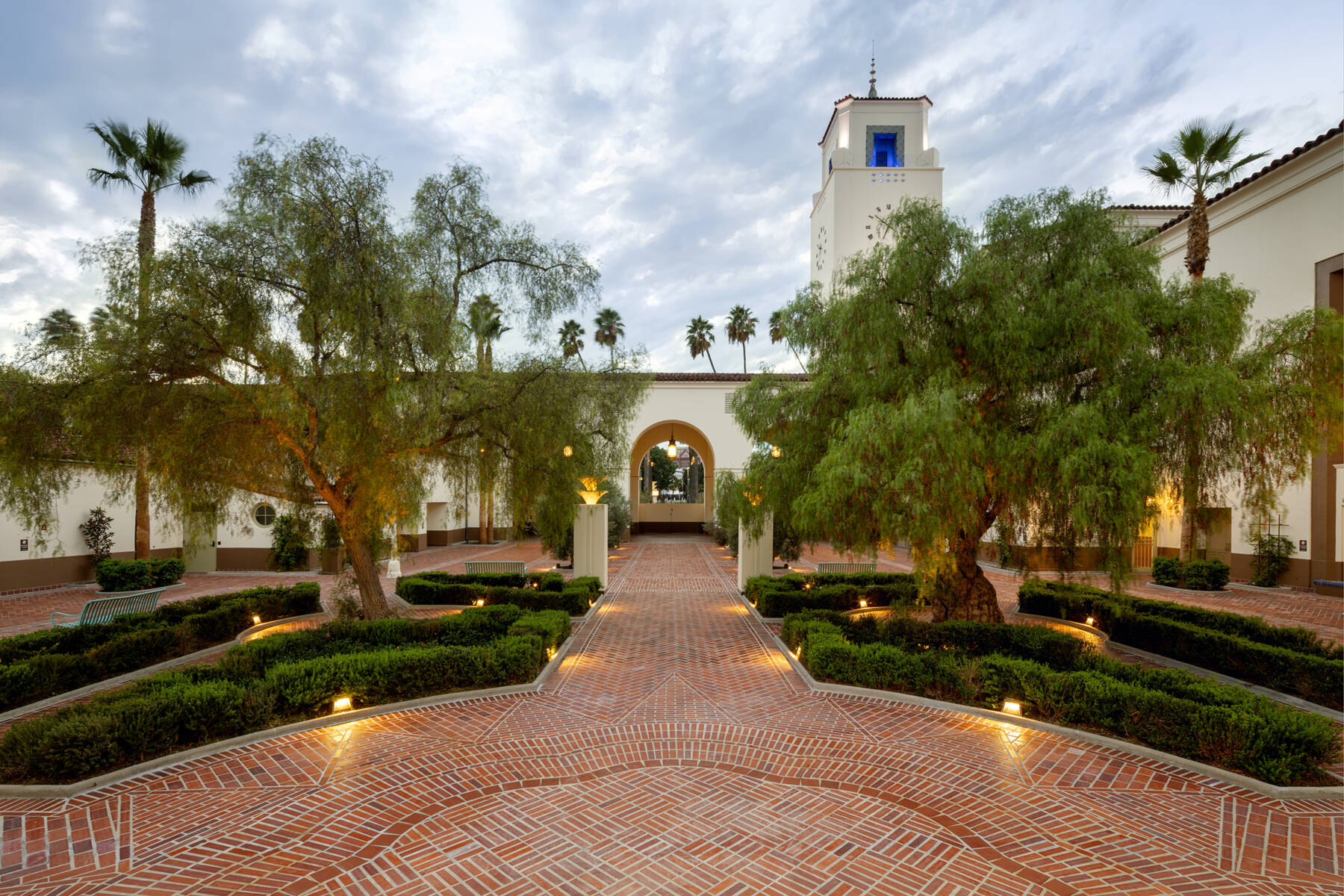 A view from above of a circular, multi-level courtyard with ornate railings, white columns, red tile floors, and a central fountain surrounded by greenery. Spiral staircases connect the different levels.We're celebrating 24 award winning projects, as well as the Trustee's Awards for Excellence and four President's Awards at the Mission Inn in downtown Riverside. This special celebration is followed by a ticketed reception with food and drinks. Purchase your tickets before they sell out!