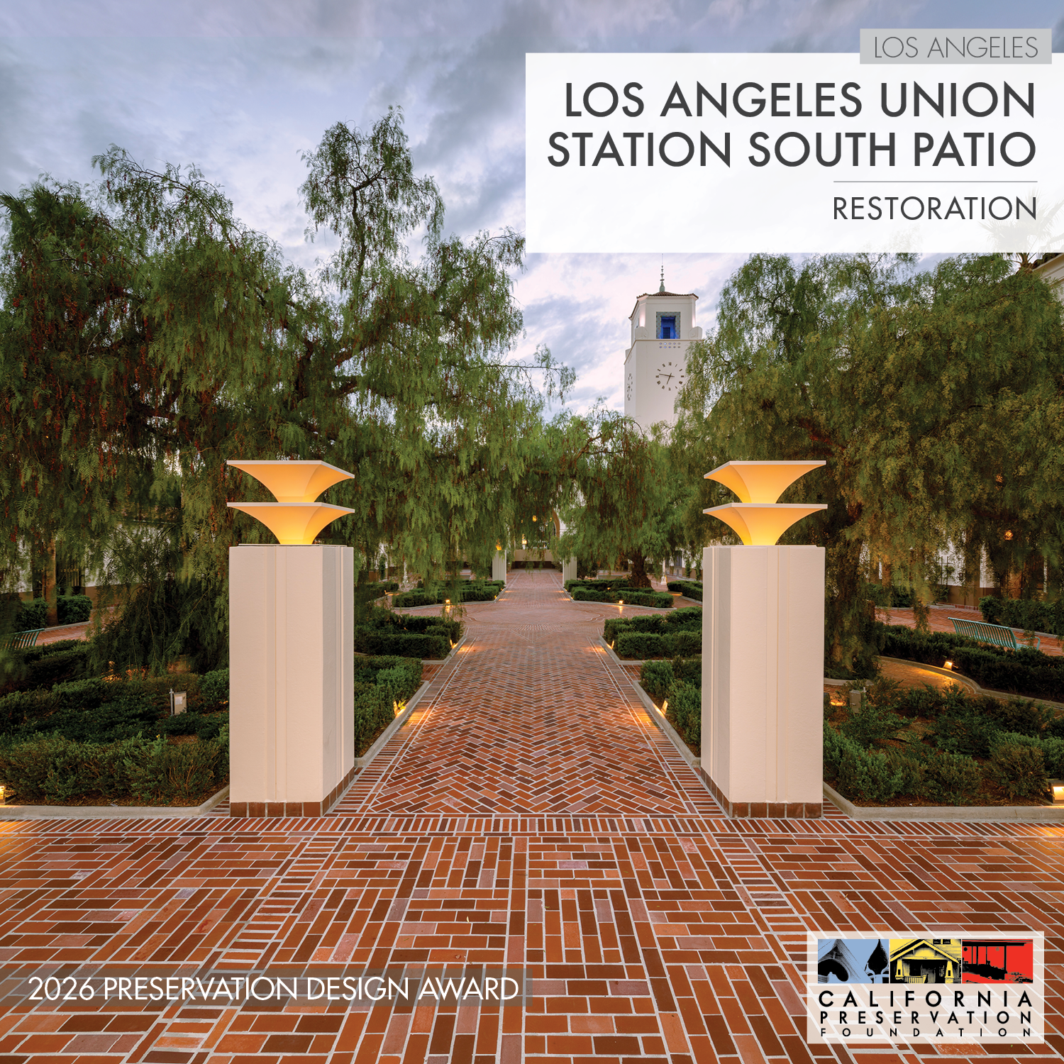 Los Angeles Union Station South Patio is a winner for the 2026 Preservation Design Award in the category of Craftsmanship/Preservation Technology. Award recipients are selected by a jury of top professionals in the fields of architecture, engineering, planning, and history, as well as renowned architecture critics and journalists. Tickets and sponsorship options are available at californiapreservation.org/programs/awards/.