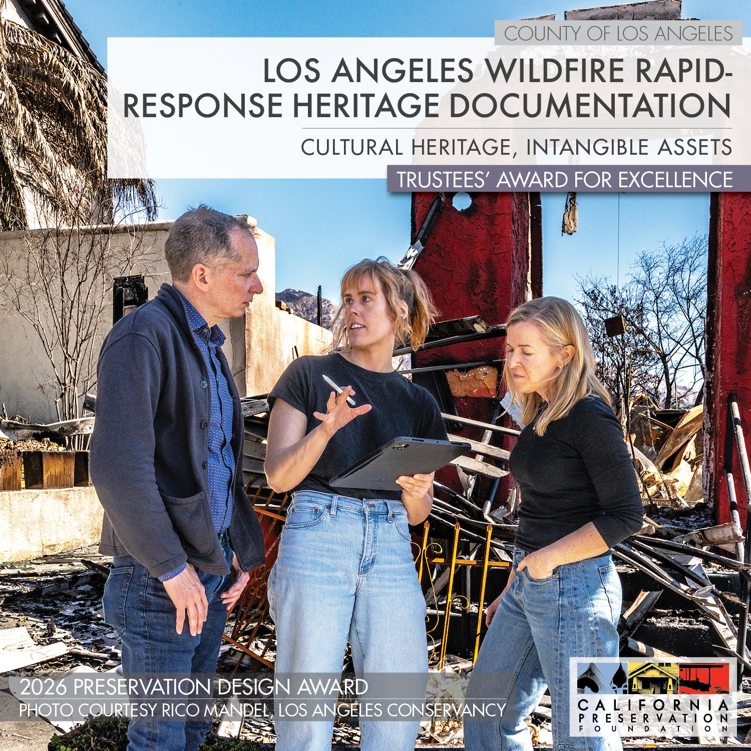 Los Angeles Wildfire Rapid-Response Heritage Documentation is a winner for the 2026 Preservation Design Award, receiving the prestigious Trustees’ Award for Excellence in the category of Cultural Resource Studies, Reports. Award recipients are selected by a jury of top professionals in the fields of architecture, engineering, planning, and history, as well as renowned architecture critics and journalists. Tickets and sponsorship options are available at californiapreservation.org/programs/awards/.