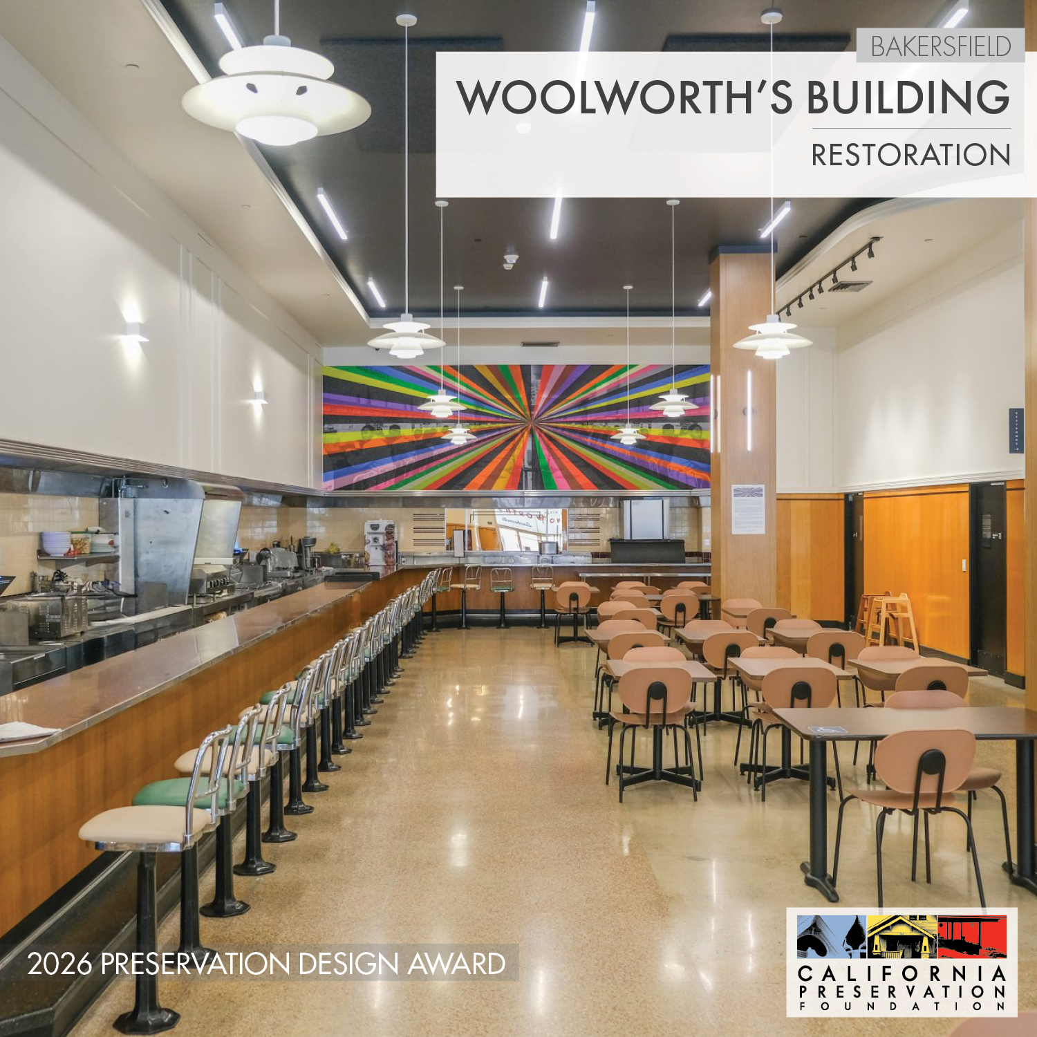 Woolworth’s Building is a winner for the 2026 Preservation Design Award in the category of Restoration. Award recipients are selected by a jury of top professionals in the fields of architecture, engineering, planning, and history, as well as renowned architecture critics and journalists. Tickets and sponsorship options are available at californiapreservation.org/programs/awards/.