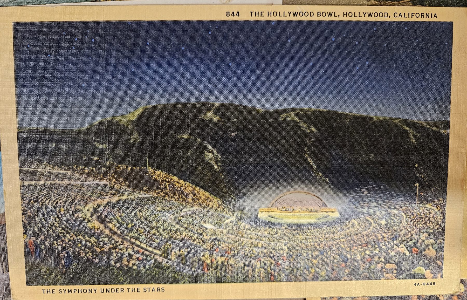 - Los Angeles classics such as the Hollywood Bowl, Mann’s Chinese Theatre (two cards), the LAX Theme Building, the Coliseum, and a 1964-postmarked Pacific’s Cinerama Theatre card.